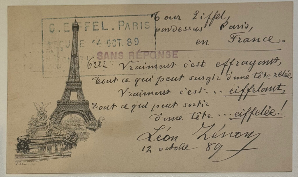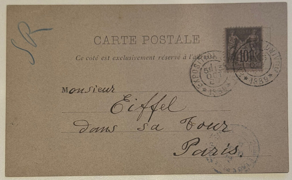 消印には「TOUR EIFFEL – PARIS」、そして1889年10月15日の日付。宛先はMonsieur Eiffel, dans sa Tour, Paris…(エッフェル氏、彼の塔の中、パリ)間違いなく、エッフェル塔の中からギュスターヴに宛てて投函されたものです😆