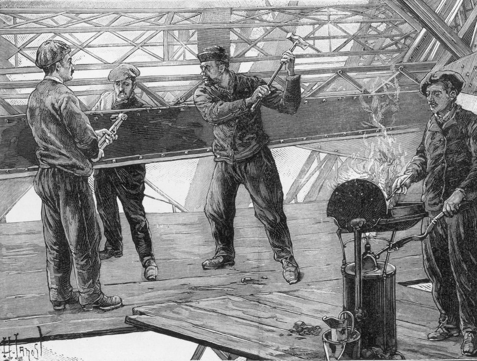リベットによる接合は、現在の溶接と違って「熱した鉄を叩き込む」作業でした。